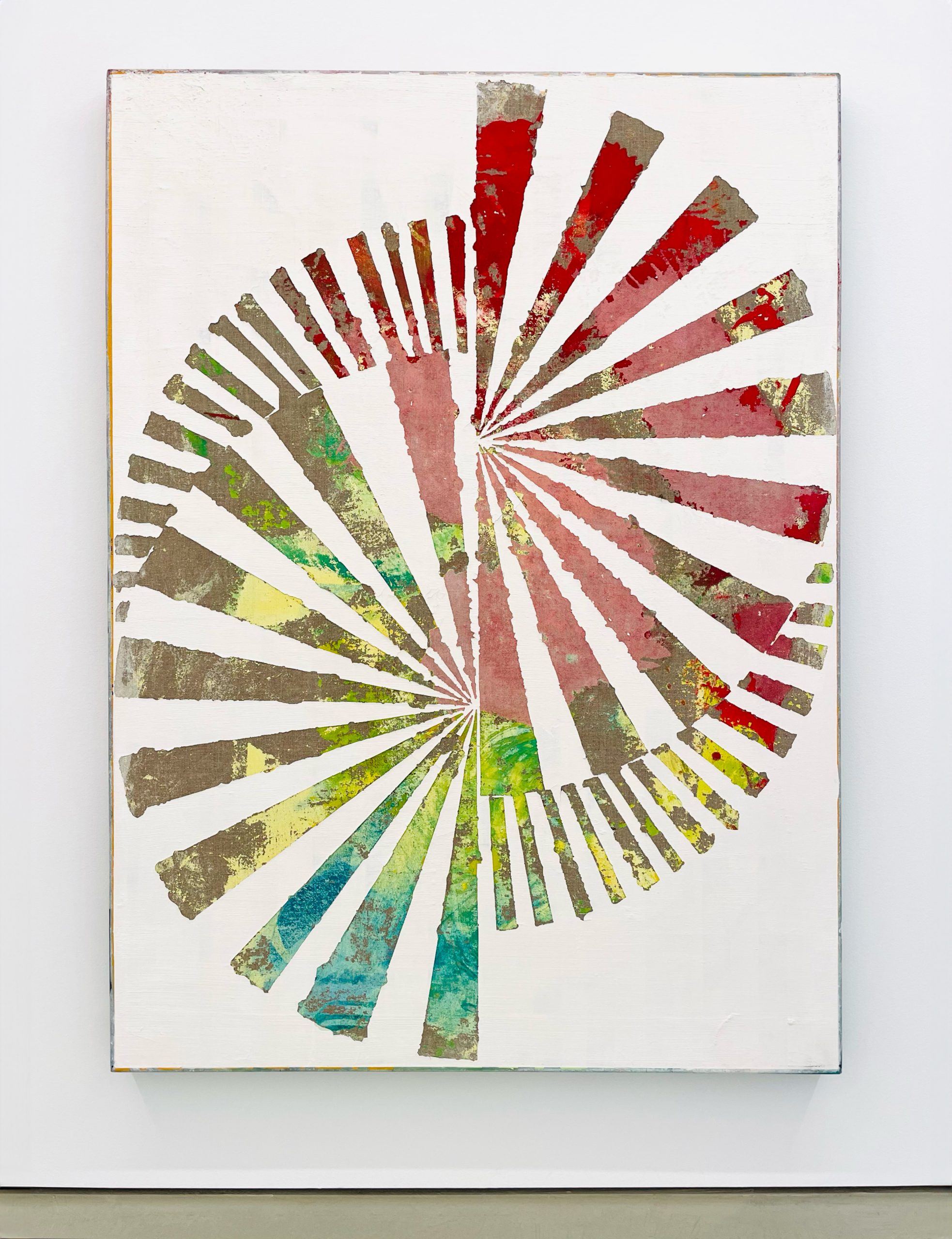 Meine abstrakten Bilder und ihre geometrischen Formen haben einen eigenen Körper. Die Bilder erscheinen nicht flach, sondern wirken wie Objekte im Raum – oder wie ein physisches Gegenüber. Farbe spielt für mich dabei eine räumliche, geradezu skulpturale Rolle. Gleichzeitig ermöglicht die im Prozess entwickelte Malerei dem Betrachter ein vielseitiges, mehrdimensionales Erleben. Über einen monatelangen Zeitraum entstehen vielschichtige und stofflich präsente Gemälde: ich konstruiere und verwerfe, übermale oder trage Farbe ab. Über Konstruktion und Dekonstruktion gelange ich zu einer Einheit von Form, Farbe und Material. Der schrittweise Arbeitsprozess wird für den Betrachter zugleich sichtbar gemacht: Beschwingte Linien, versetzte Farbflächen und Verläufe von Arbeitsspuren leiten den Blick durch die Bildebenen.